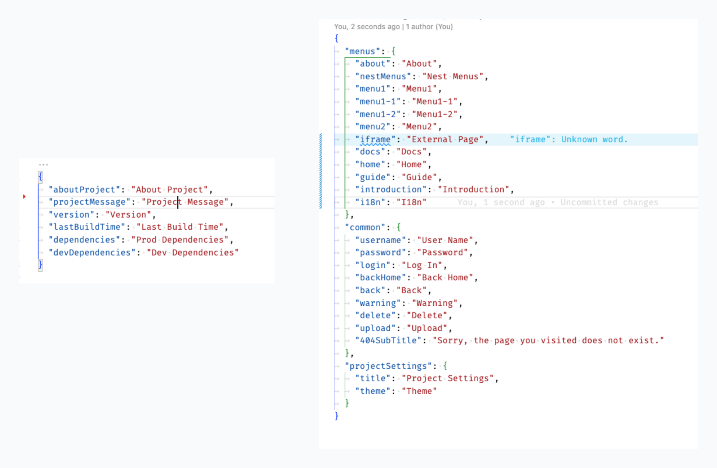 国际化默认使用的是 JSON 文件,这会导致调试和书写非常困难。利用 VSCode 的 lokalise.i18n-ally 插件可以获得良好的编写体验和类型提示。