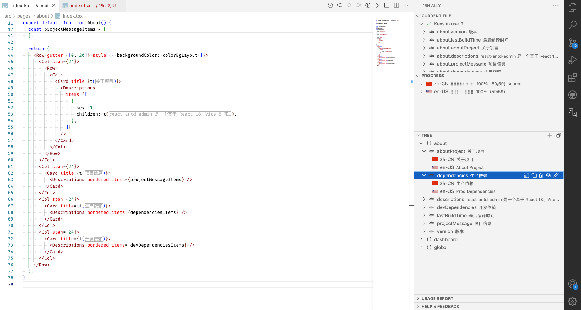 }正确配置之后,将会看到如下友好的页面,代码中被翻译的文字,以及侧边栏中构建的翻译字典树:
